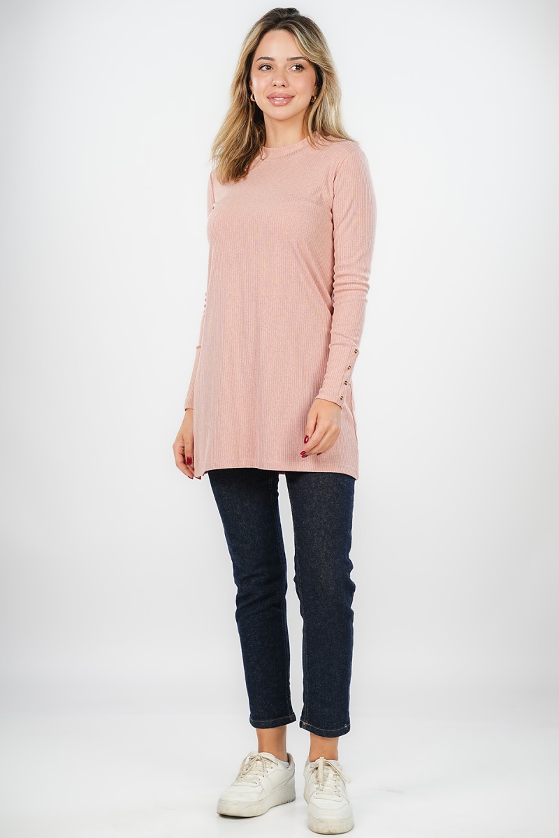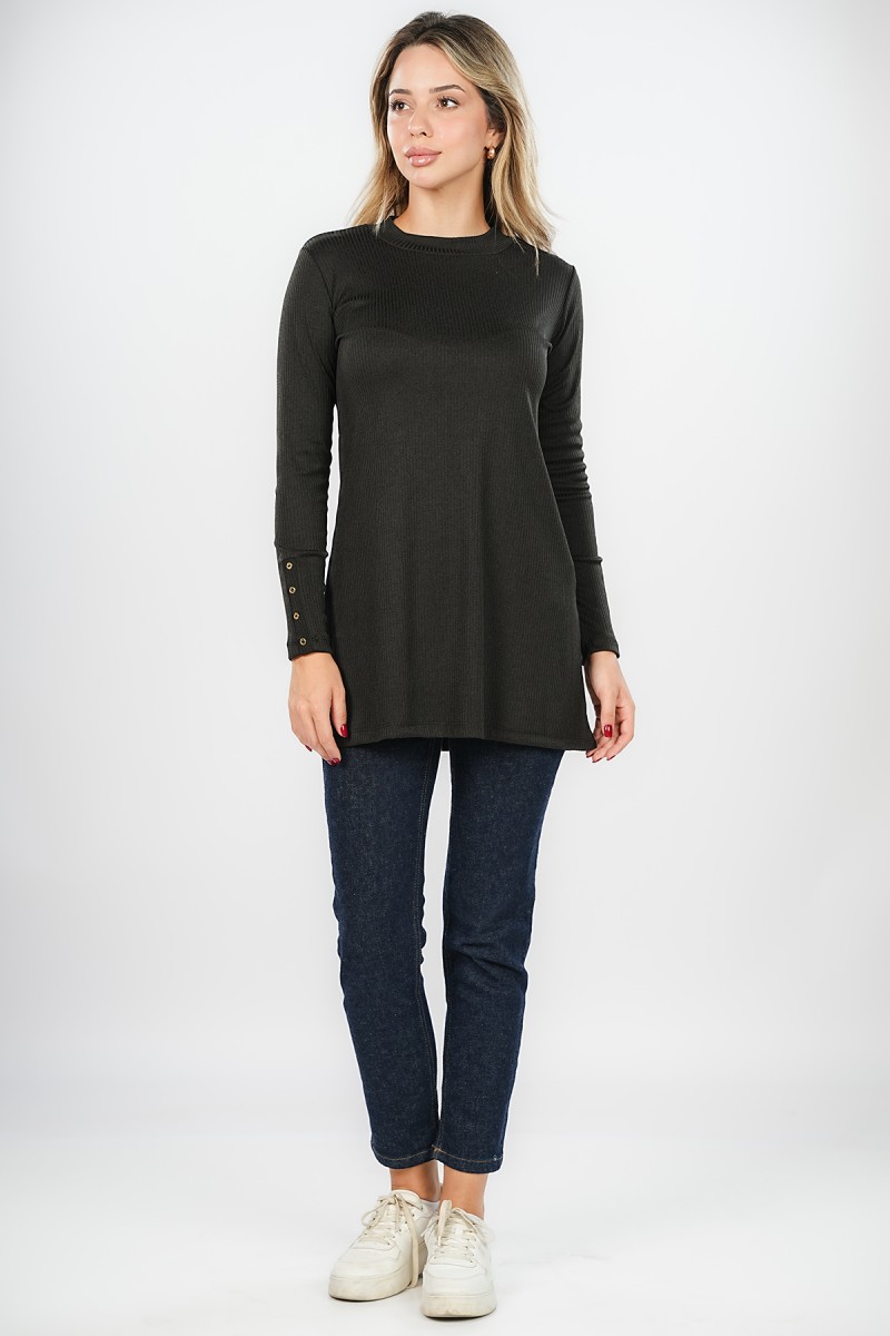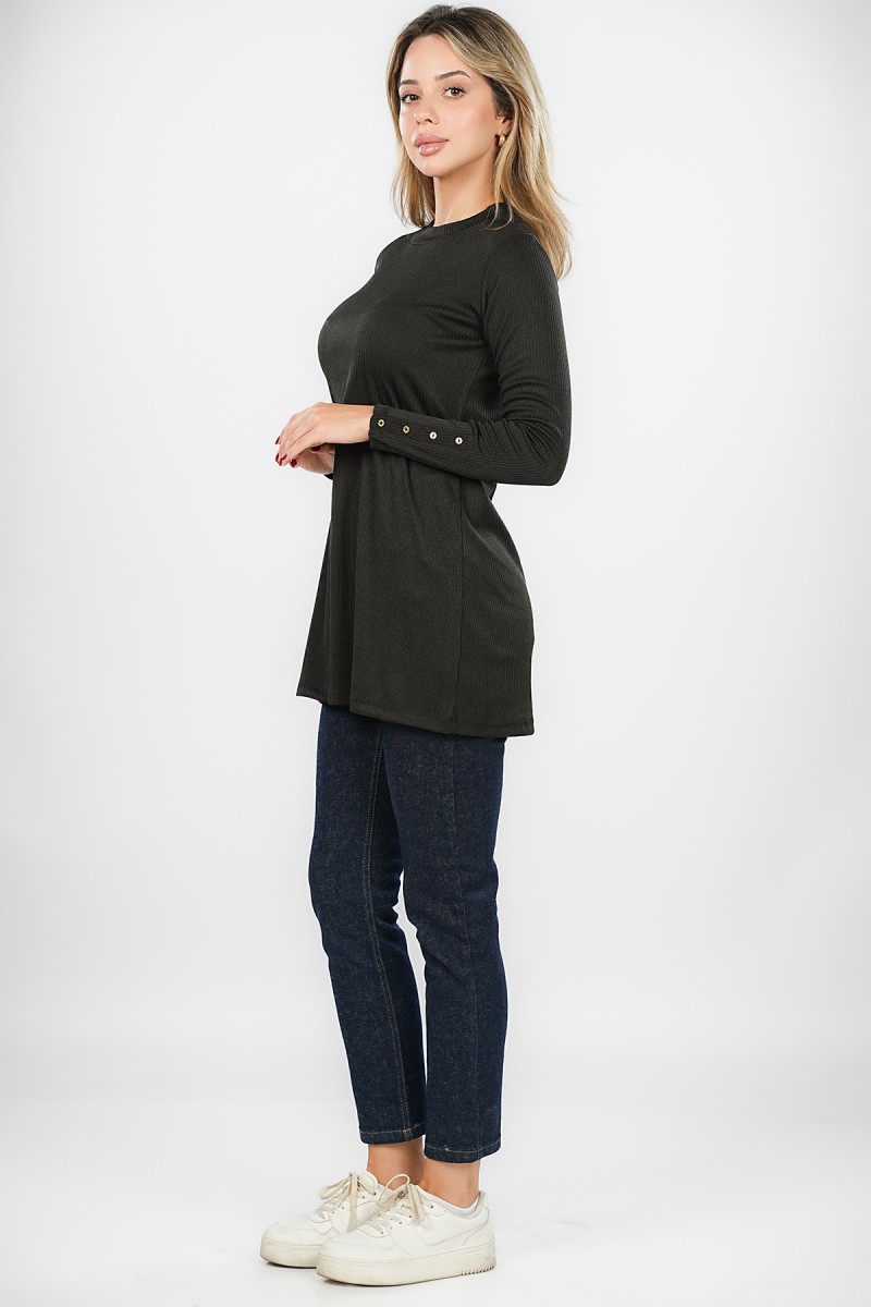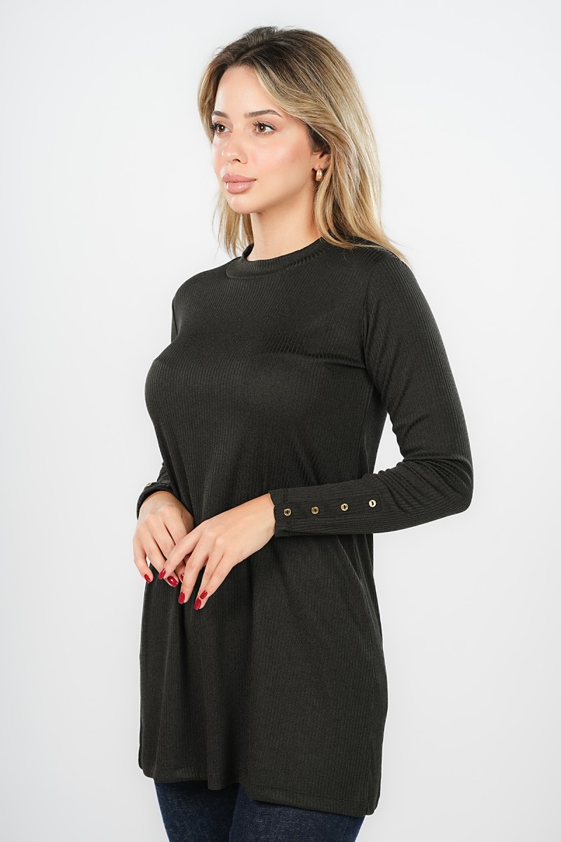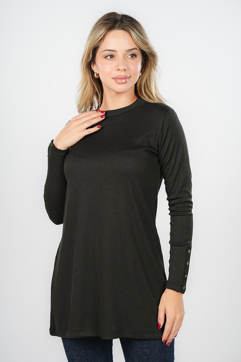 Pull long orné de boutons sur les manches, conçu dans un style élégant et discret, idéal pour les femmes voilées ou celles qui privilégient un look plus réservé.