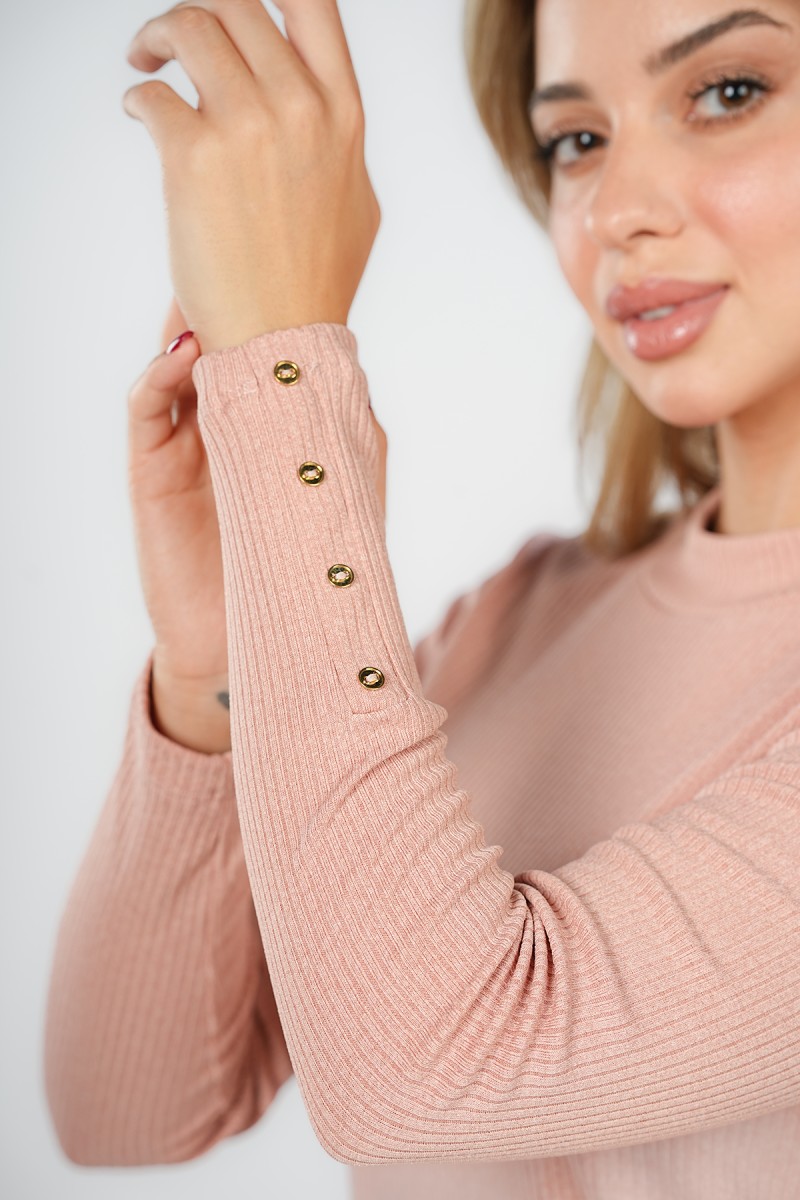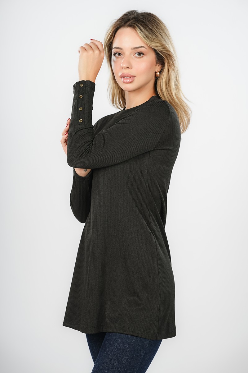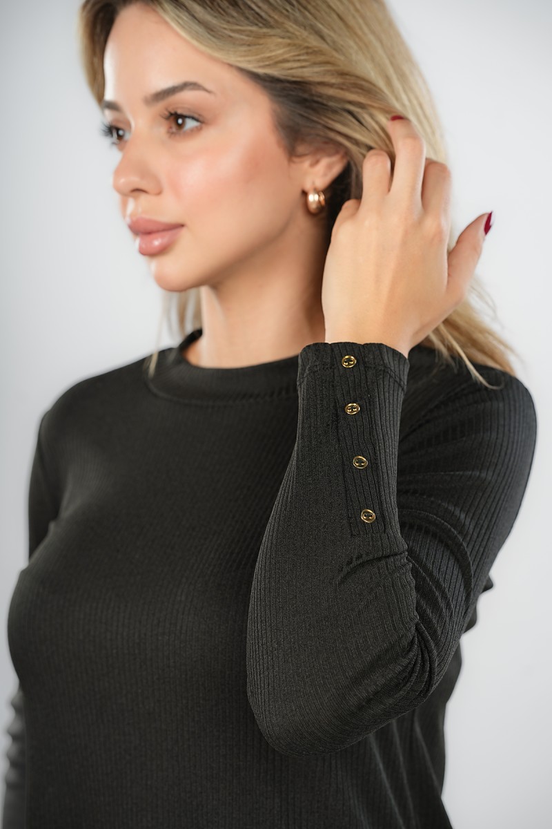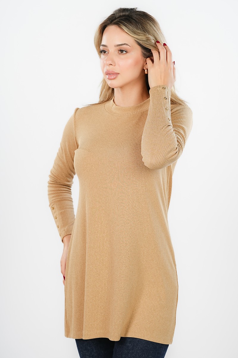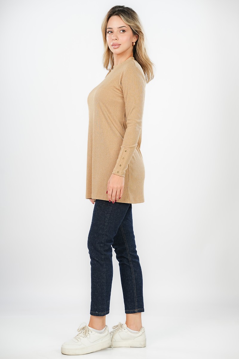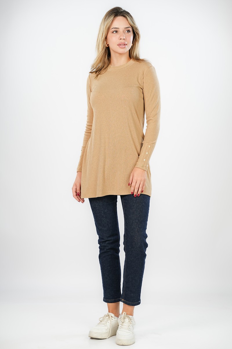 Pull long orné de boutons sur les manches, conçu dans un style élégant et discret, idéal pour les femmes voilées ou celles qui privilégient un look plus réservé.