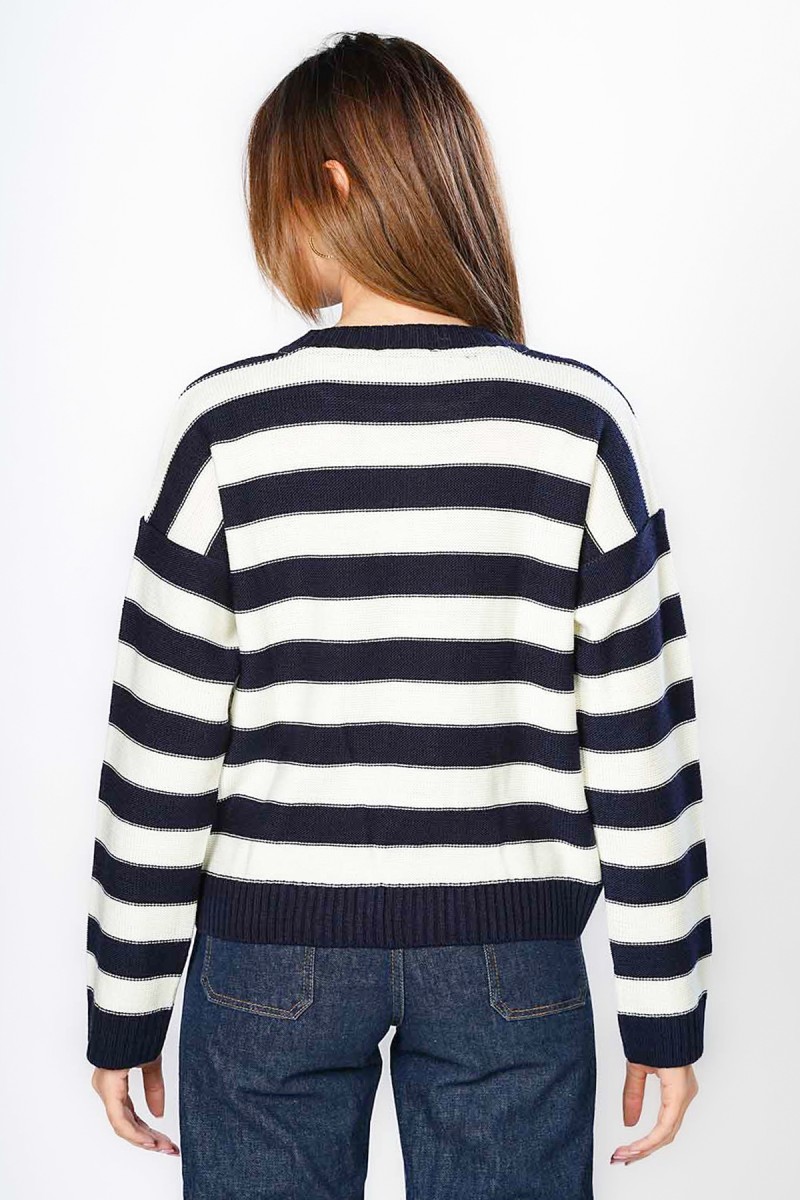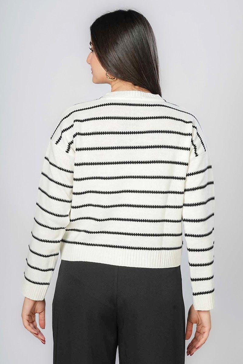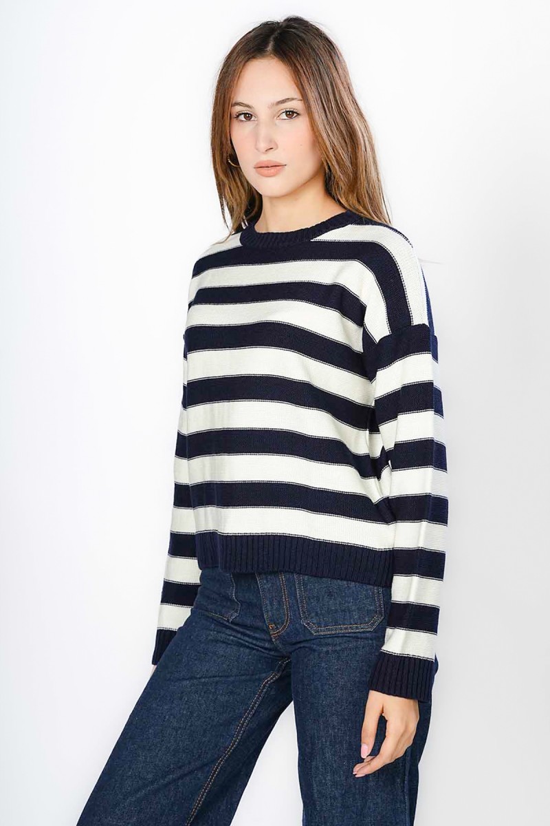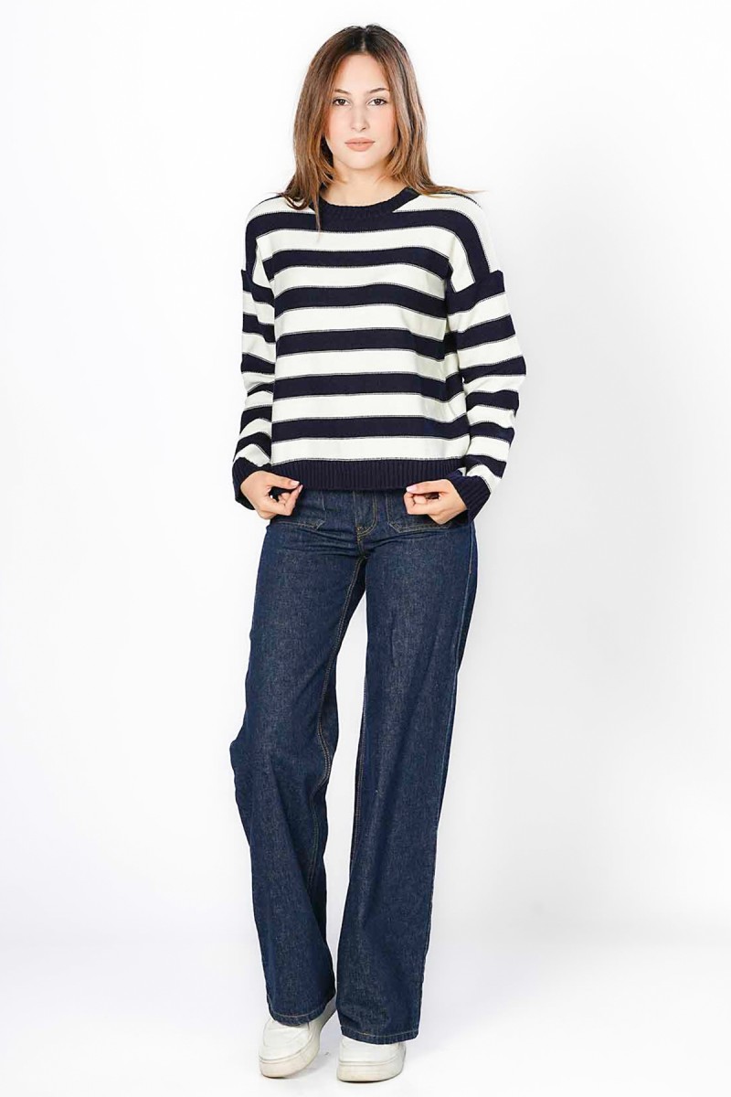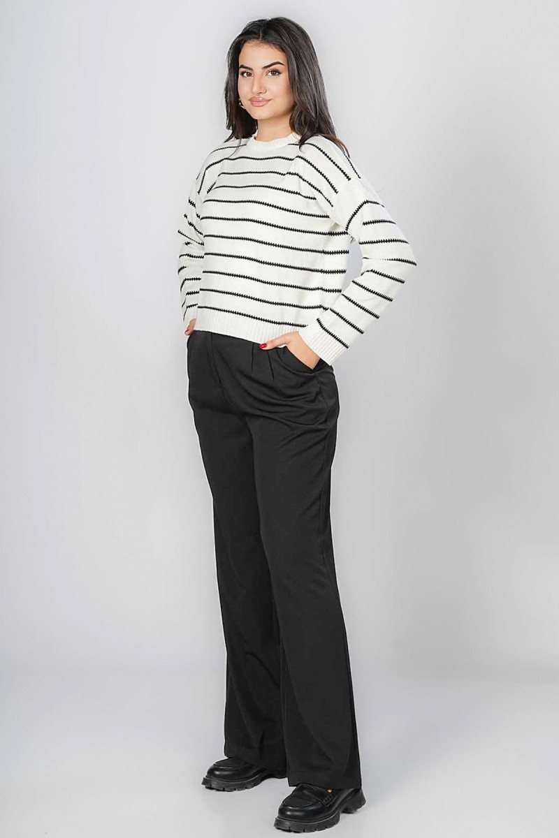 Un pull à rayures classique et élégant, avec une coupe droite et un col rond. Il est porté avec un pantalon noir pour un look intemporel et sophistiqué