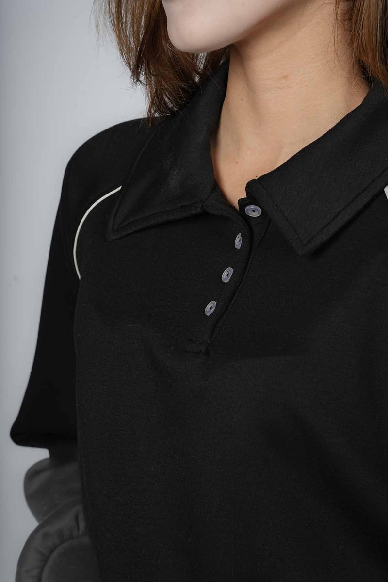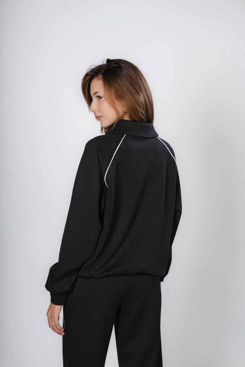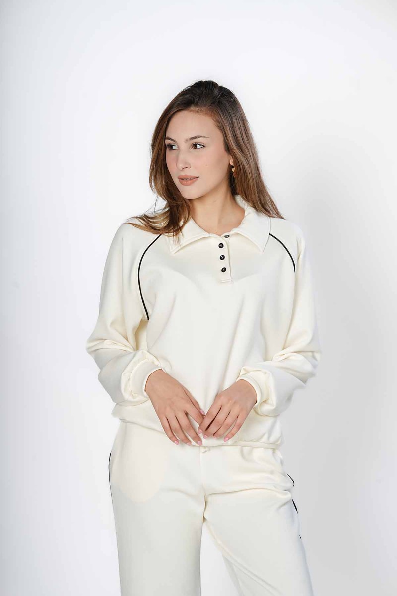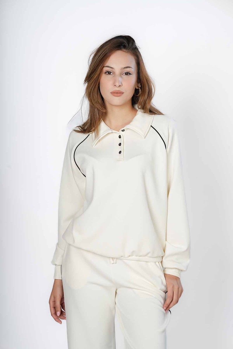Pull à manches longues doté d’un col à boutons et de lignes contrastées le long des épaules. Sa coupe ample offre un confort optimal, idéal pour un look casual et moderne