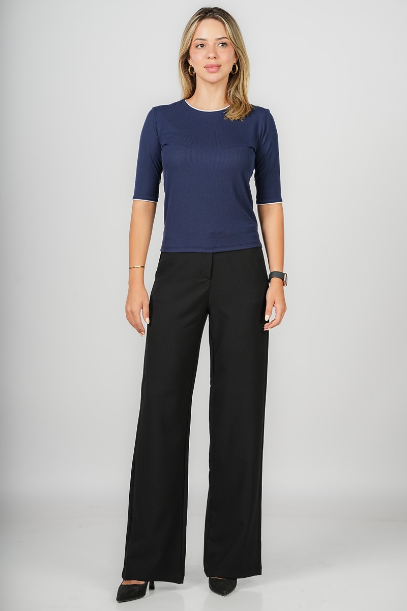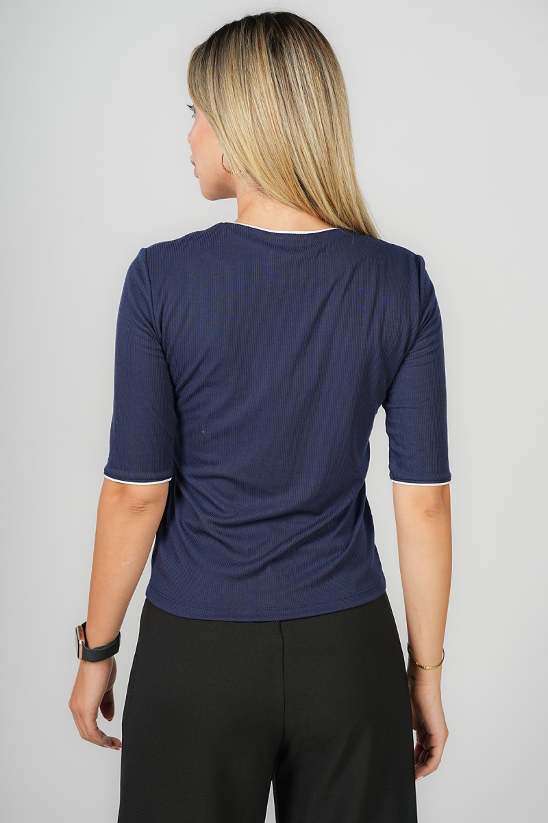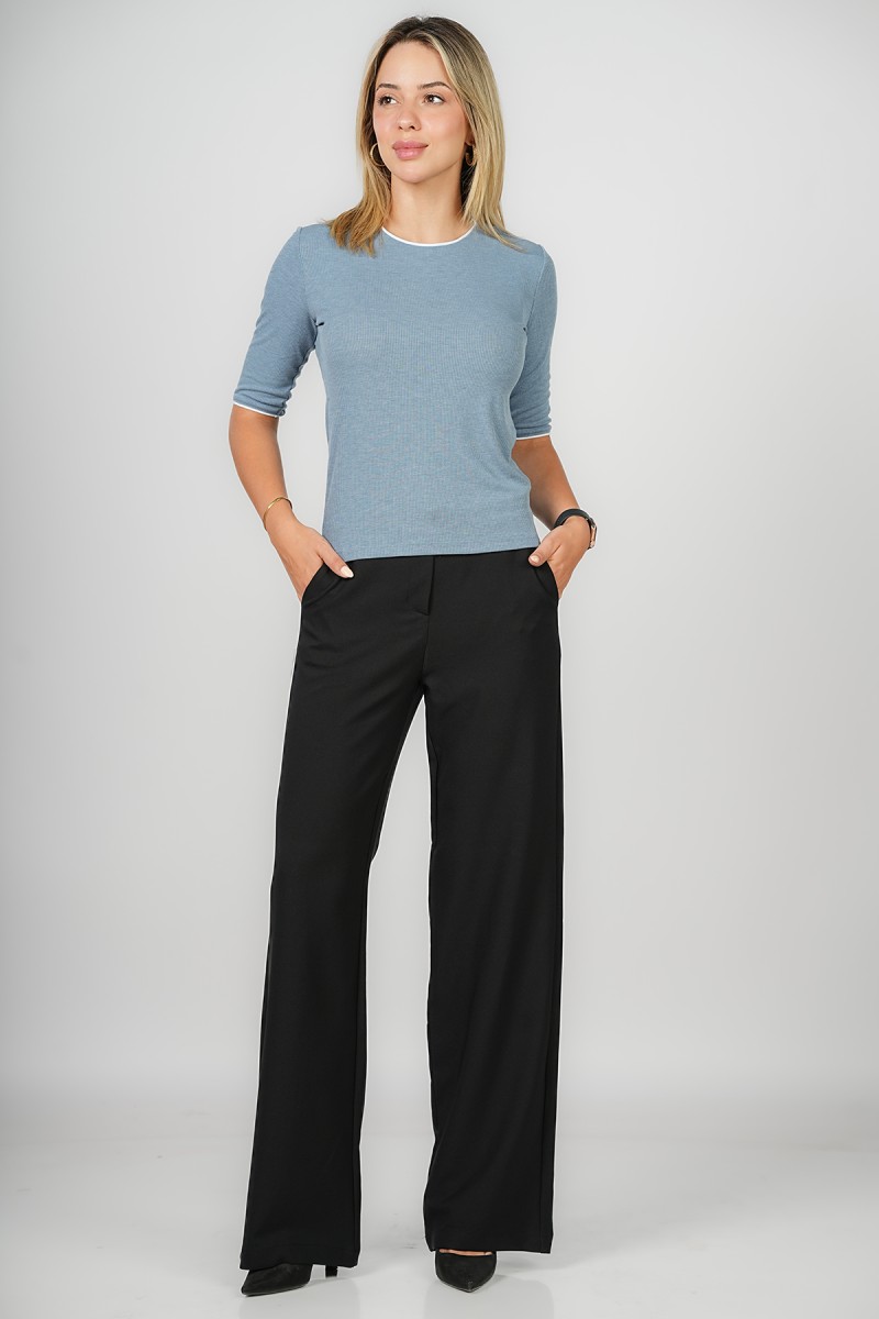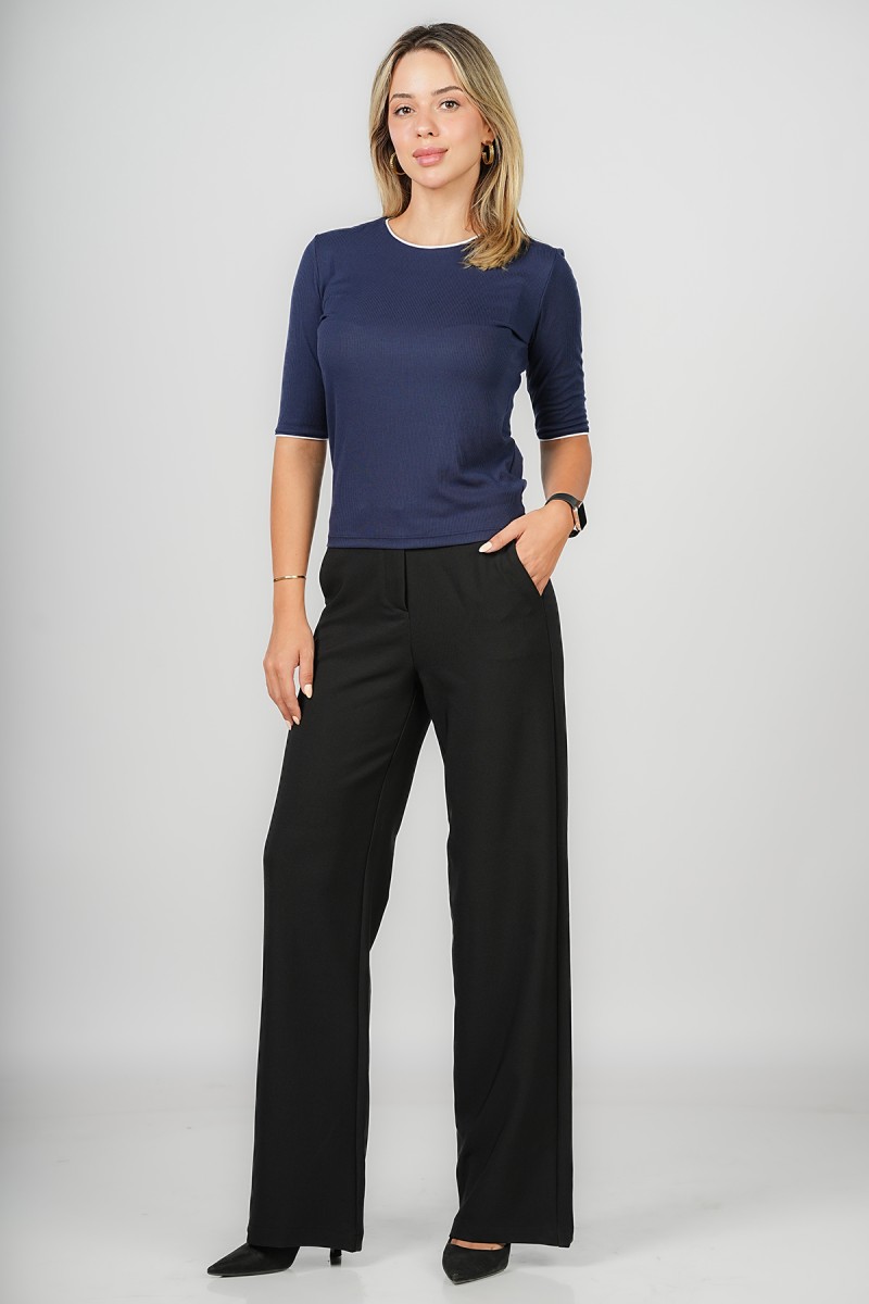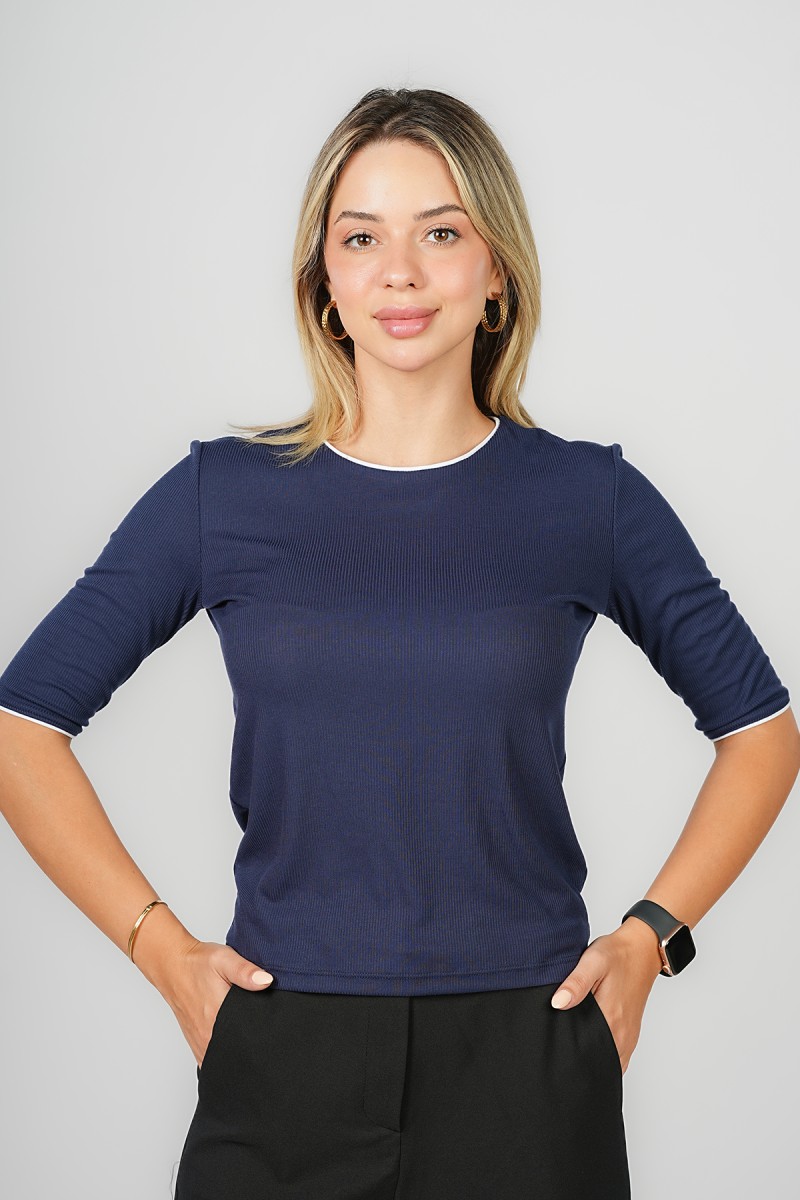 T-shirt basique à manches 3/4, rehaussé d’une bordure blanche élégante pour une touche de contraste subtile. Un modèle confortable et facile à associer pour un look casual et moderne
